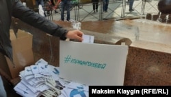 Как передает корреспондент Север.Реалии, участникам акции предлагают открытки с голубями, на них они пишут слова поддержки и складывают в общий ящик. Тем, кто подписал открытку, дают шарики синего и зеленого цветов (цвета флага Хабаровского края) и маленькую табличку с голубем. Некоторые подписываются под общим иском против поправок к Конституции.