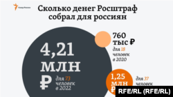Число оштрафованных и суммы штрафов последовательно росли год от года, говорит Светлов. Если в 2020 году "РОСштраф" собрал 760 тысяч рублей для 18 человек, то в 2021 году сумма сборов составила 1 миллион 259 тысяч рублей для 37 оштрафованных. В 2022 году, когда началась война, суммы сборов выросли более чем в три раза – до 4 миллионов 213 тысяч рублей, проект помог 73 людям.
