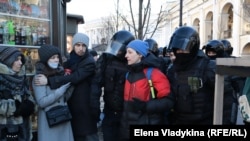Митинг 27 февраля практически сразу начался с задержаний – полицейские забирали в автозаки любого, кто разворачивал плакаты. К полицейским попадали и те, кто просто стоял в толпе, скандировал лозунги или хлопал. Задержания были жесткими: людей вырывали из толпы, одному из мужчин порвали джинсы, другому участнику акции – Глебу Тарасову – при задержании сломали нос.