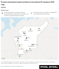 В Коми проблемы со связью наблюдались в более чем 100 деревнях. Чиновники в начале 2022 года обещали решить вопросы в этих населенных пунктах до 2030 года. В 14 поселках и деревнях вышки 4G-связи должны были появиться до конца 2022 года, обещал в январе глава Республики Коми Владимир Уйба. В сентябре программу свернули, построив только две вышки. Теперь остальными вышками чиновники обещают заняться в 2023 году.